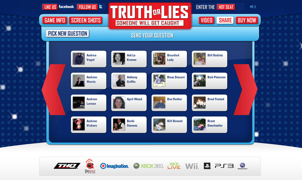 Not every game speaks to the same person, and the work had to reflect that. Costume Quest was a charming, story-driven RPG aimed at younger players, a microsite experience built to match its whimsical tone without the distraction of social mechanics. Truth or Lies was a different animal entirely, a party game for adults that lived as much on Facebook as it did on consoles. The canvas app let players answer questions, post results, and pull friends into the game directly from their feed, turning the marketing into an extension of the experience itself.